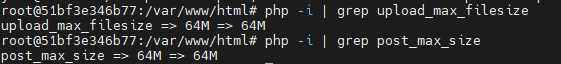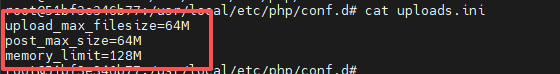 说明:这一步只能临时修改容器内部配置,如果容器再次重启,新添加、修改的配置文件都会失效,必定会回到初始状态,因此最好在前面的步骤中就成功挂载uploads.ini配置文件。这一步只是作为容器内部学习而保留。