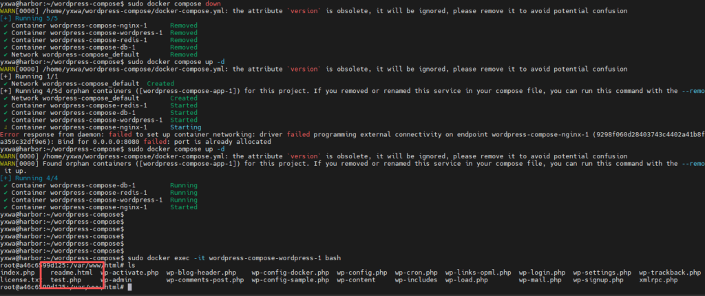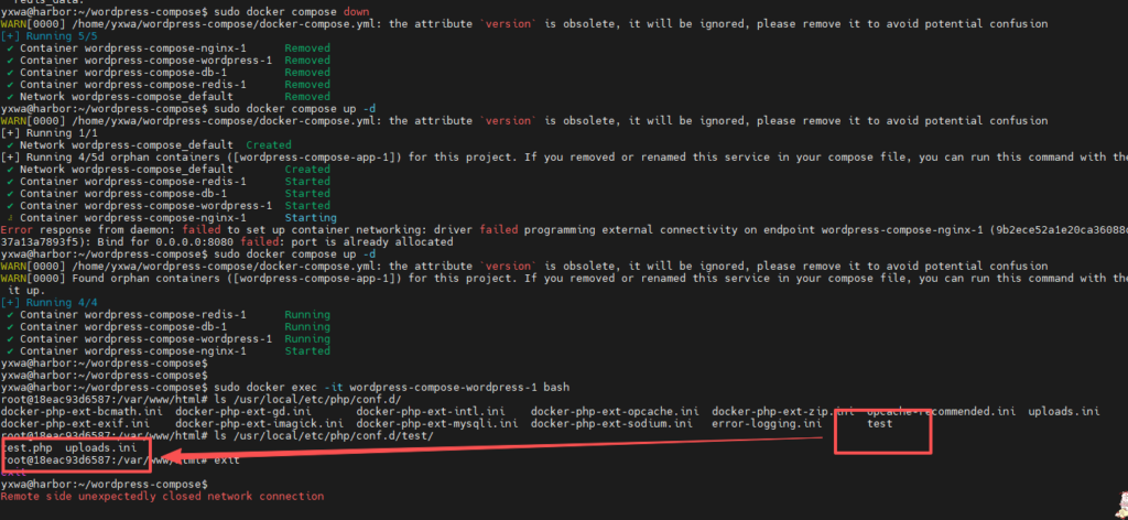 在/home/yxwa/wordpress-compose/test-php-conf路径下创建test.php后删除重建容器,重新进入容器内部查看/usr/local/etc/php/conf.d/test路径下是否存在test.php