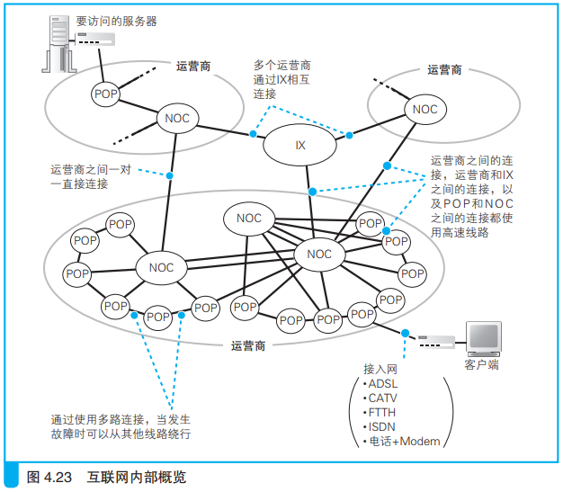 网络包通过接入网之后,到达运营商POP的路由器。互联网的实体并不是一个组织单独运营管理的单一网络,而是由多个运营商网络相互连接组成的。FTTH、ADSL等接入网是与用户签约的运营商设备相连的,这些设备就被成为POP,互联网的入口就在这里网络包通过接入网之后,到达运营商 POP 的路由器