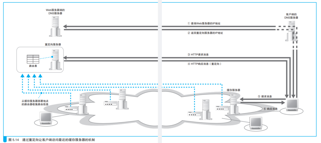 当触发重定向的时候,首先需要将重定向服务器注册到Web服务器端的DNS服务器上。这样,客户端会将HTTP请求消息发送到重定向服务器上面。这个方法有利有弊,优点在于重定向是根据客户端发送来的HTTP消息的发送方IP来估算距离,因此精度比一般缓存服务器的DNS服务器精度较高。缺点就很明显了:HTTP消息的交互次数过多,开销也随之上升