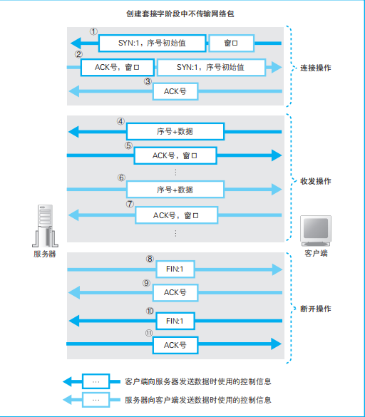 跟客户端也大差不差,先连接、后处理。当TCP头部中的控制位SYN为1时,表示这是一个发起连接的包,之后检查包的接收方端口号,确认有无相同并处于等待状态的套接字。没有的话就发送错误包。处理完之后,TCP模块就会执行接受连接的操作